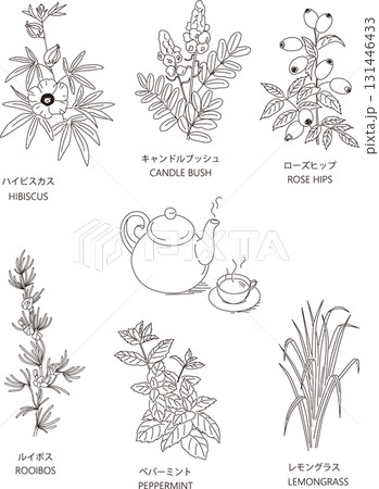 六種草藥和茶具的線條畫插圖