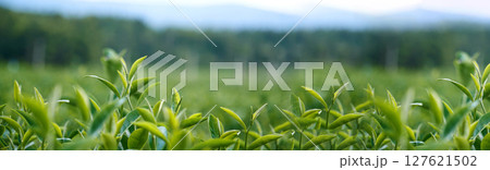 Banner Green tea tree leaves field young tender bud herbal Green tea tree in camellia sinensis organic farm. Panorama Fresh Tree tea leaf plant green nature in herbal farm background with Copy Space