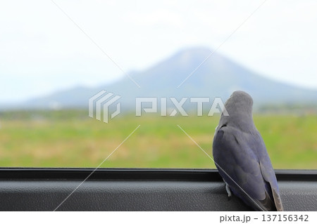 一隻玄鳳鸚鵡正透過火車車窗眺望大山。