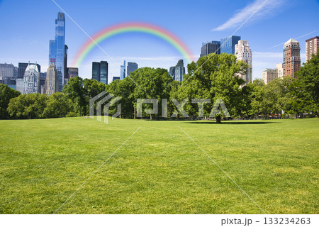 Green lawn in Central Park with skyscrapers