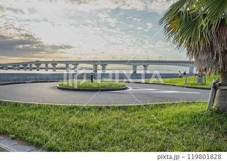 從臨空展望廣場停車場看到的新特麗亞大橋、名鐵機場線以及雲海的傍晚大海(愛知縣)