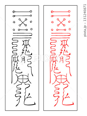 阿蘇山的毛筆畫標誌。高原上的一匹馬和阿蘇山。