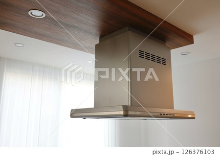 廚房裡安裝了一個銀色的抽油煙機通風系統。