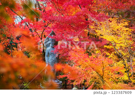 autumn foliage tunnel and Guanyin statue at Eikando garden, Kyoto