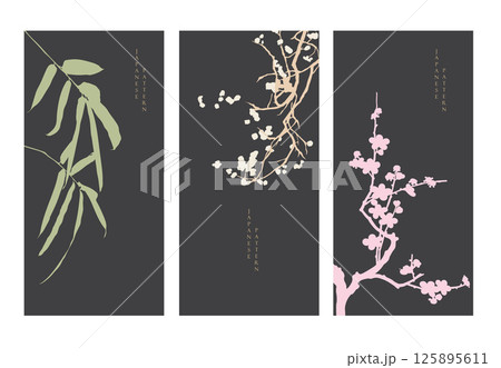Japanese background with Asian traditional icon vector. Cherry blossom flower and bamboo leaf pattern elements. Geometric pattern in vintage style