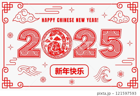 Line Chinese lunar new year banner with snake in 2025 numbers in red and white. Vector traditional festive greeting card featuring a coiled reptile snake animal coiled within 2025 surrounded by clouds
