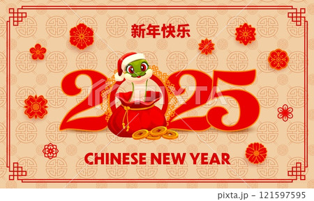 Chinese New Year holiday banner with funny snake and purse with golden coins, vector greeting card. 2025 Chinese New Year holiday banner for lunar calendar, snake and golden coins in flowers ornament