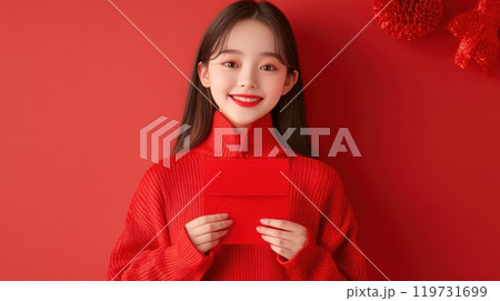 Smiling Asian Woman Wearing Traditional Cheongsam Holding Red Envelope