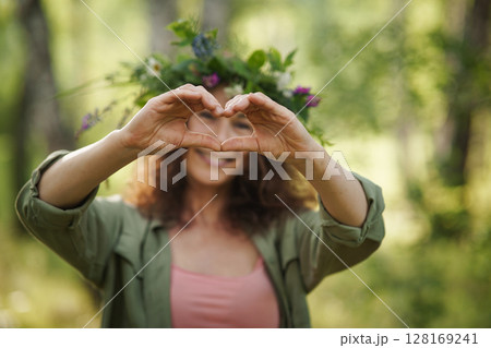 Woman making heart shape with hands in nature, sunny forest, joyful mood. Concept of mindfulness, eco lifestyle, spiritual connection outdoors