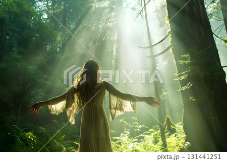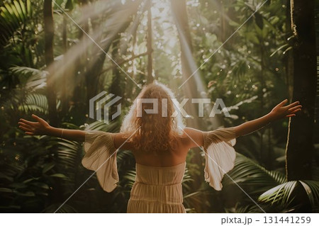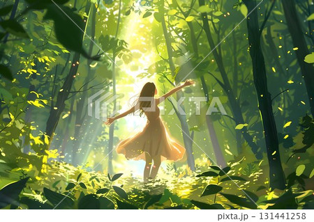 Woman with flower crown twirling in green meadow during summer, no face visible. Concept of nature therapy, eco lifestyle, unplugged leisure and mindful freedom
