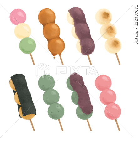 手繪水彩插圖,描繪了美味的串燒餃子和茶具(御手洗餃子、紅豆餃子和三色餃子)。