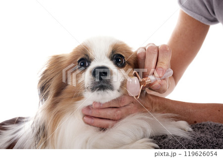 Two Shih Tzus sitting next to each other, looking at the camera, isolated on white