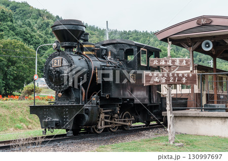 北海道遺產森林鐵道蒸汽機車雨宮21號在車站停靠