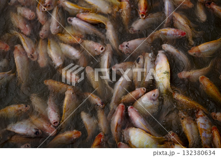 Group Of Ruby Fish Waiting To Be Fed, vibrant underwater scene ideal for food industry ads, marine documentaries, and promotional visuals.