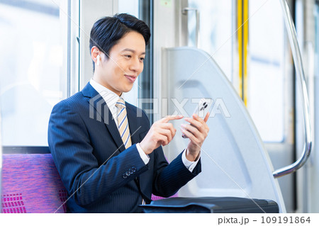一位中年商人在上下班時看著智慧型手機。照片由京王電鐵株式會社提供。