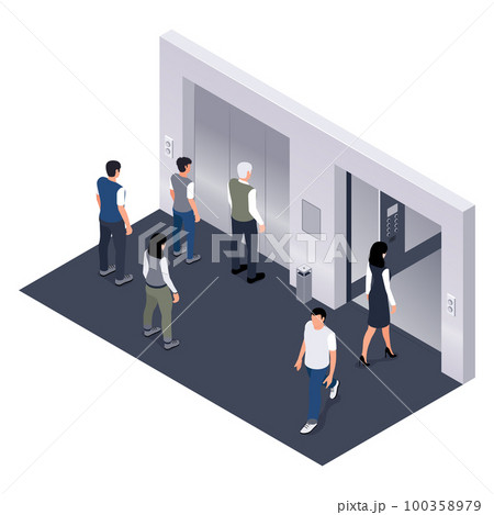 People are waiting for the elevator vector flat illustration, man and women, worker with cargo using lift transportation