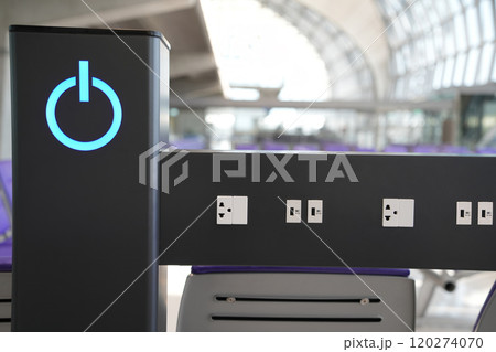 A designer wooden bench with sockets and a yellow sign for charging smartphones in the waiting room.
