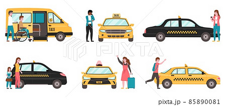 Taxi passengers service. City transport using, disabled people transportation, urban yellow car. Men and women waiting, calling and boarding in auto, different ways. Vector set