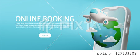 Airplane flight tickets online booking service advertising landing page3D cartoon vector design, passenger jet airplane