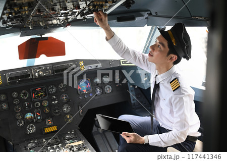 Back view of asian pilot dressed in a uniform preparing for flight in the cockpit of an aircraft