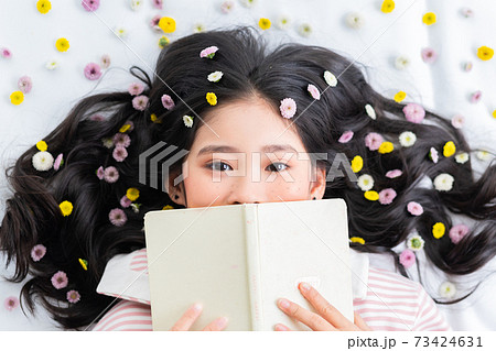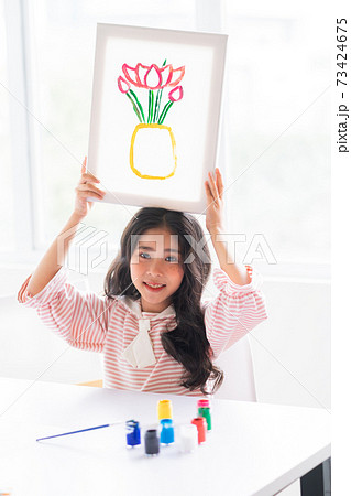 little asian girl with long black hair sitting at desk in her room writing or drawing on note book