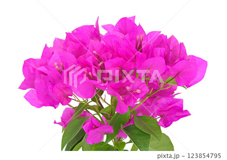 Bright pink bougainvillea flowers cascading down on white wall background. Generative AI