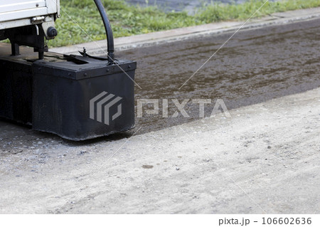 攤舖作業圖:瀝青乳化後撒養護砂的路基