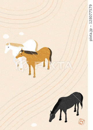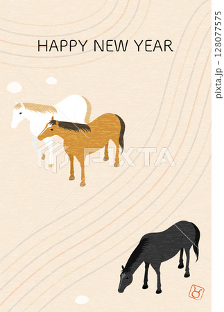 新年賀卡結束,2026 年馬年的日式新年賀卡,馬和枯山水花園的簡單等距插圖