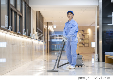 一位高級清潔人員清潔建築物的肖像,微笑著看著鏡頭
