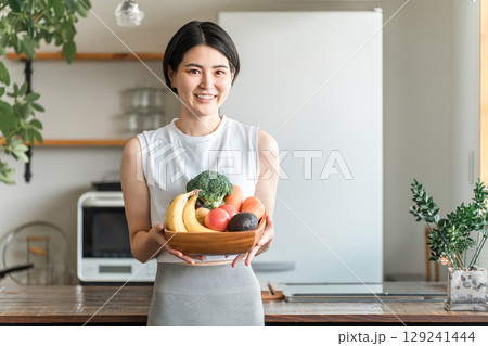 一位身穿運動服的年輕亞洲女性在廚房前拿著蔬菜(缺乏蔬菜、營養平衡、綠色和黃色蔬菜)