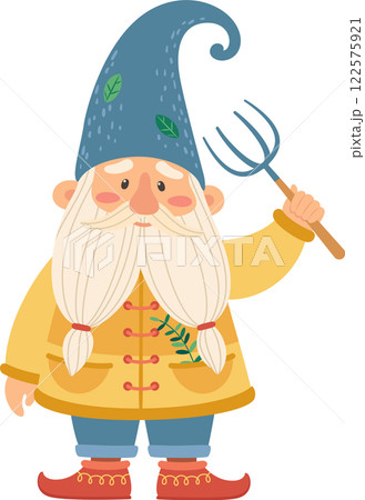 Cheerful garden gnome, complete with a pointed blue hat and long white beard, stands proudly holding a pitchfork, ready to tend to his beloved garden