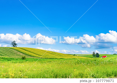 北海道夏天藍天和草捲土地