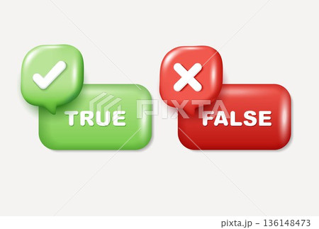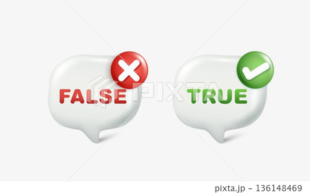 3D speech bubbles with True False text, green check mark and red cross icons. Vector illustration for online quiz, feedback, right or wrong choice, survey, voting and decision making concept.