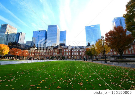 秋日清晨的陽光灑在中央車站…美麗的紅磚車站大樓「東京車站」。