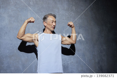 一位老年男子赤裸上身,擺出健美姿勢。運動圖片