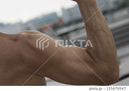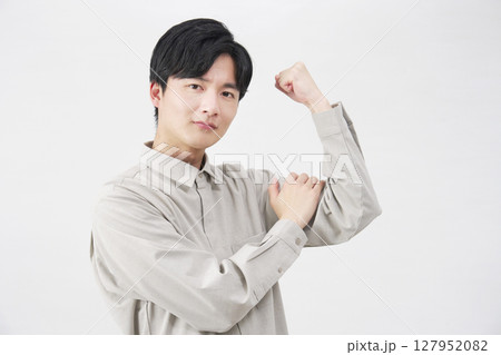 身穿羽絨外套的男士,白色背景下露出二頭肌