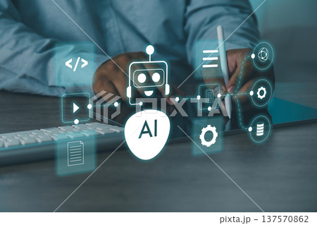 AI workflow automation and chatbot integration concept showing interacting with tablet displaying connected process ai Transfer of data between application