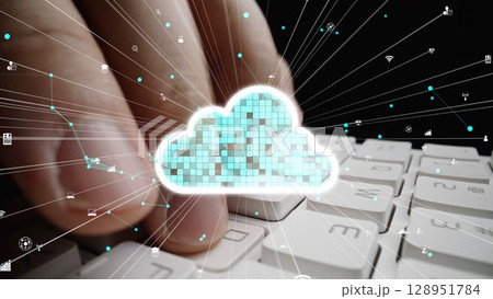Abstract depiction of cloud computing with digital data transfer, technology concept of data security and connectivity on modern keyboard background xenic
