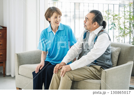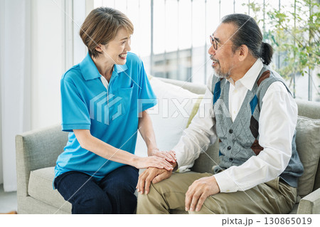 一名護理人員正在協助一位坐在輪椅上的老人。