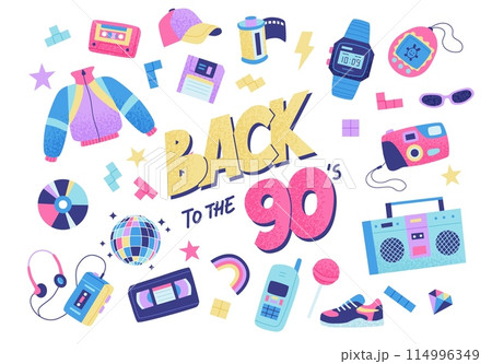 90s retro elements set with lettering. Bright multicolour collection. Vector illustration in trendy flat style