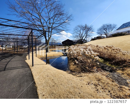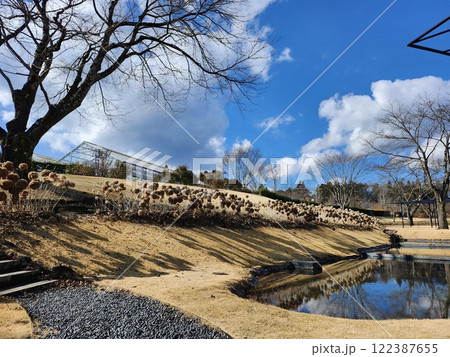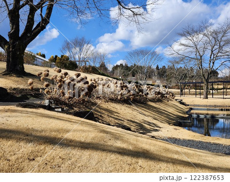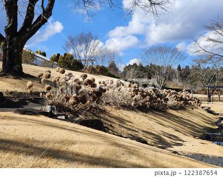 冬季花園形象:枯萎的繡球花和晴朗的天空