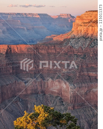A wooden tabletop sits atop a cliff, overlooking the Grand Canyon at sunset. The vast canyon stretches out before the viewer, with the sun setting in the distance.