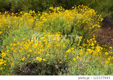 Yellow Desert Marigolds in Nevada with Rocky Background at Eye Level