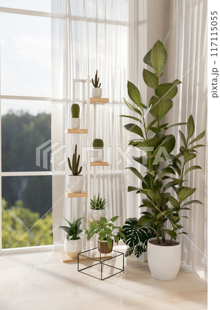 A minimal indoor plant stand with indoor plants and succulents by the window in a contemporary room.