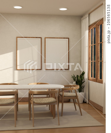 A beautiful Scandinavian dining room interior with a dining table with wooden chairs