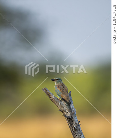 wild multicolor or colourful bird Eurasian or European roller or Coracias garrulus closeup or portrait perched on branch in scenic natural green background at grassland forest of central india asia