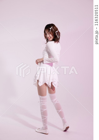 A Korean woman in her 20s wearing a white ballet core look with a light pink background