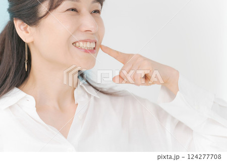 Stylish Asian woman with long hair poses elegantly, showcasing a confident expression in a studio setting