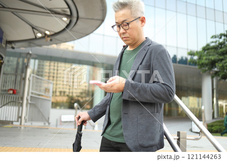 年輕的亞洲商人在辦公大樓前用智慧型手機交談