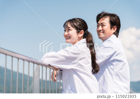 醫生、醫生、研究人員、藥劑師、牙醫和醫務工作者的男男女女在醫院屋頂上看風景